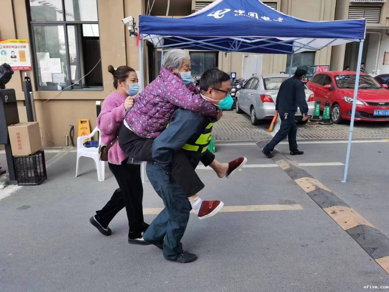 10月29日12时许,瑶海区铜陵路街道花冲盛世家园封控点,一名70多岁老人腿部骨折出院返家,因出租车不能进小区,老人家里只有大爷和一个女儿,不知怎么把老人搀扶回家,正在一筹莫展之际,被正在执勤的合肥保安行业支援瑶海区疫情防控志愿队员——安徽国盾保安集团公司杨金堃看见,他立刻一个箭步跑过去帮忙把老人背上肩,从小区门口一直背到老人家后才离开。