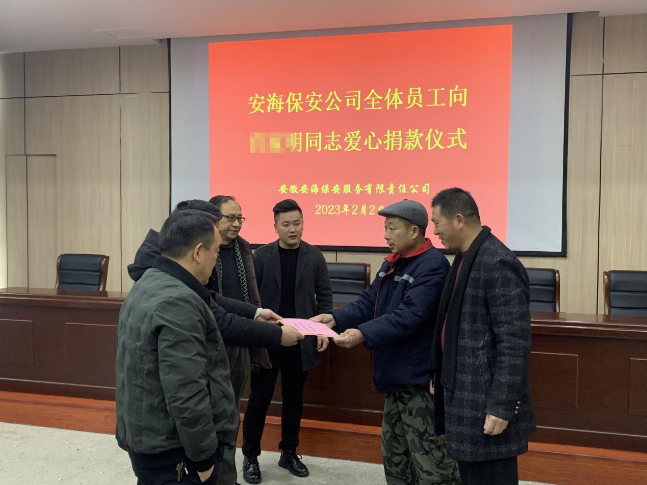 在得知此消息后,安海保安公司立即向全体员工发出“爱心捐款倡议书”,号召大家伸出捐助之手,帮助其渡过难关!倡议一经发出,就得到了公司员工们的积极响应,在此次爱心捐款活动中,共募集善款四万余元。