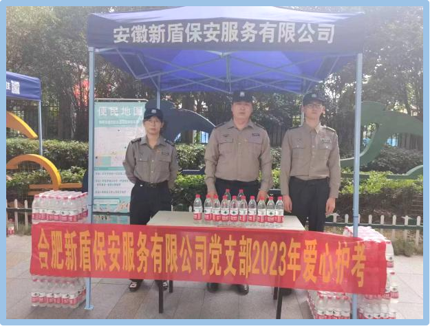 新盾公司党支部在合肥市第九中学门口设立了爱心送水点,共同开展助力高考志愿者服务活动,支部党员热情的给送考来的家长和考生分发矿泉水,提醒防暑降温并为考生加油鼓励。