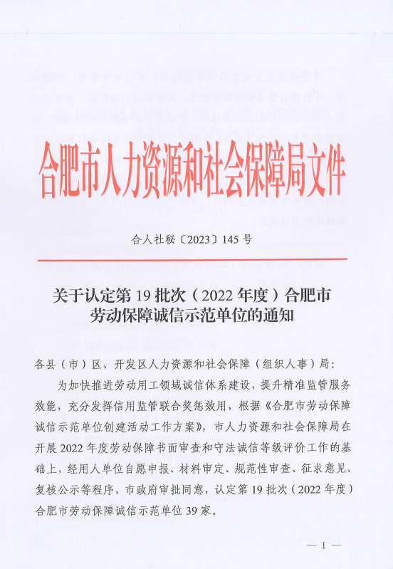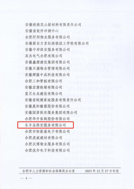 近日,合肥市人力资源和社会保障局组织开展了:合肥市第19批次(2022年度)市级“劳动保障诚信示范单位”认定工作,长丰县保安服务有限公司,在众多企业中脱颖而出,荣获合肥市“劳动保障诚信示范单位”称号。