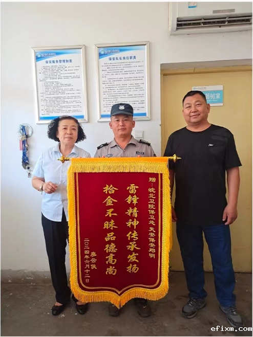 6月13日上午,皖北卫生职业学院保卫处及天安保安服务有限公司邓明收到宿管人员廖女士送来的一面绣有“雷锋精神传承发扬,拾金不昧品德高尚”的锦旗。