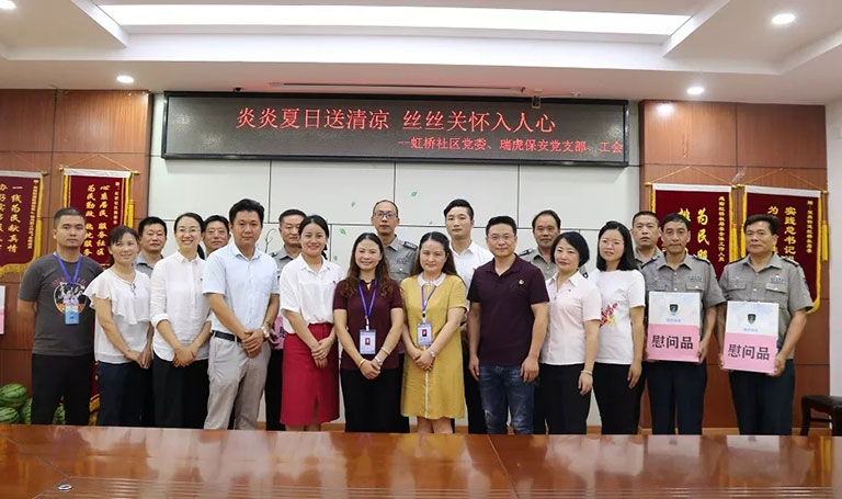 7月19日上午,瑞虎保安2019年“夏日送清凉”活动正式启动。虹桥社区党委书记焦常玲、社居委主任董群、党委副书记朱青、瑞虎保安党支部书记刘圣峰、执行董事刘贤虎、社区席庆泓、郑志丹等同志和我公司支部、工会主要成员以及一线职工代表出席启动仪式,我公司工会主席王静主持启动仪式。