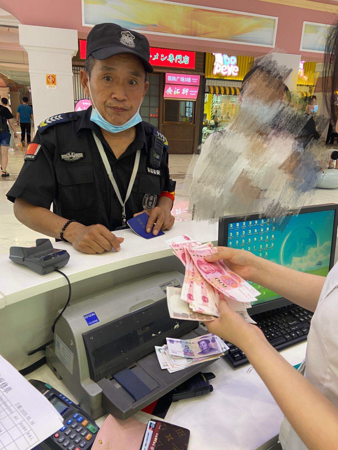 2020年5月17日,周日的三里庵国购广场正值营业高峰,安信保安公司驻三里庵国购广场保安队员任启财在巡逻值勤中捡到一个钱包,包里有现金2800元、银行卡及外币数张。任启财见钱包内金额较大,想到失主一定心急如焚,便立马把钱包交到国购广场客服中心。随后在客服中心工作人员的努力下,联系上失主杨女士。杨女士来到国购客服中心认领了丢失的钱包,并向任启财赠送了一面锦旗,感谢他拾金不昧、急人所急的义举。