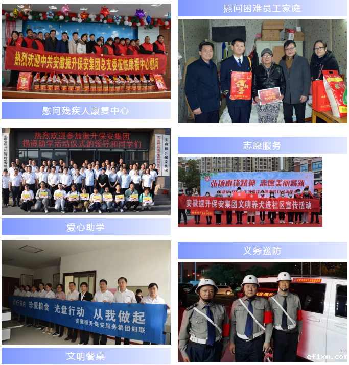 一直以来,该集团长年稳定为下岗职工、退伍军人、城市待业青年、农村剩余劳动力就业提供帮助,并始终着力解决员工最关心、最直接、最现实的问题,使企业发展成果惠及广大员工。成立“振升保安爱心基金”、“员工互助基金”,积极开展扶贫助困、捐资助学、公益慈善活动,累计慰问了六安市金安区中店乡35位“五保户”老人,先后资助了数十名员工子女上学,对部分家庭困难员工进行补助等,得到公司员工和社会的一致好评。多次荣获安徽省“爱心企业”称号,截止目前累计向社会各界捐资捐物200余万元。每逢“三八妇女节”该集团董事长亲切慰问一线女员工,连续15年除夕夜都到各驻点为坚守在工作岗位的一线保安员送上新年祝福和亲切的慰问,每年夏冬两季,该集团领导都会亲赴一线驻点给振升家人送清凉、送温暖。对口帮扶、持续资助(一直资助到大学毕业)了霍邱县马店中心小学贫困小学生,并为他们捐赠了助学善款和学习生活用品。尤其在防控新冠肺炎疫情和防洪防汛方面做出了积极的贡献。