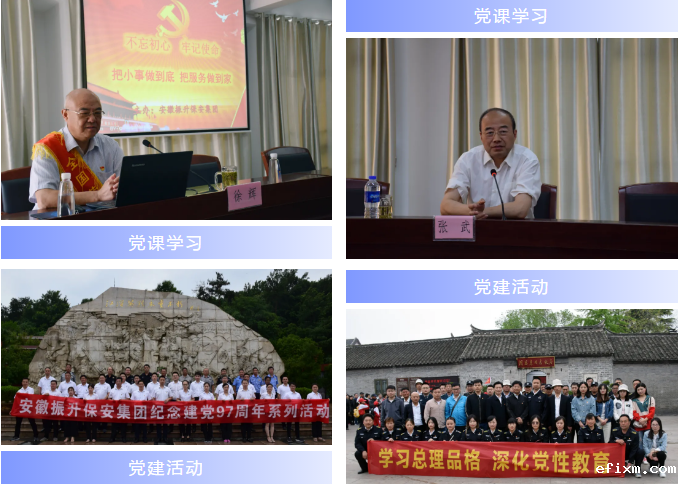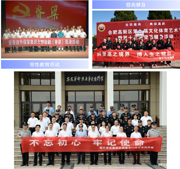 该集团先后组织员工观看大型史诗情景剧《脊梁》及《周总理回延安》、《榜样4》等党性教育电影;组织员工参加合肥高新区第十二、十三届登高健身活动;组织员工赴大蜀山烈士陵园缅怀先烈历史功绩,增强爱国主义意识,领悟中华优秀传统真谛;庆祝建党周年之际组织党员、员工赴淮安瞻仰总理故居和纪念馆等等。