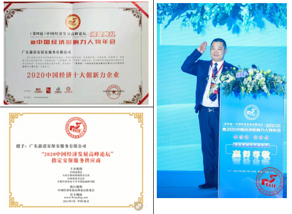 广东鑫诺安保安服务有限公司因在品牌价值、市场表现、发展潜力、创新能力等方面业绩突出,在“第四届中国经济发展高峰论坛暨2020中国经济影响力人物年会”中被授予:2020中国经济十大创新力企业。