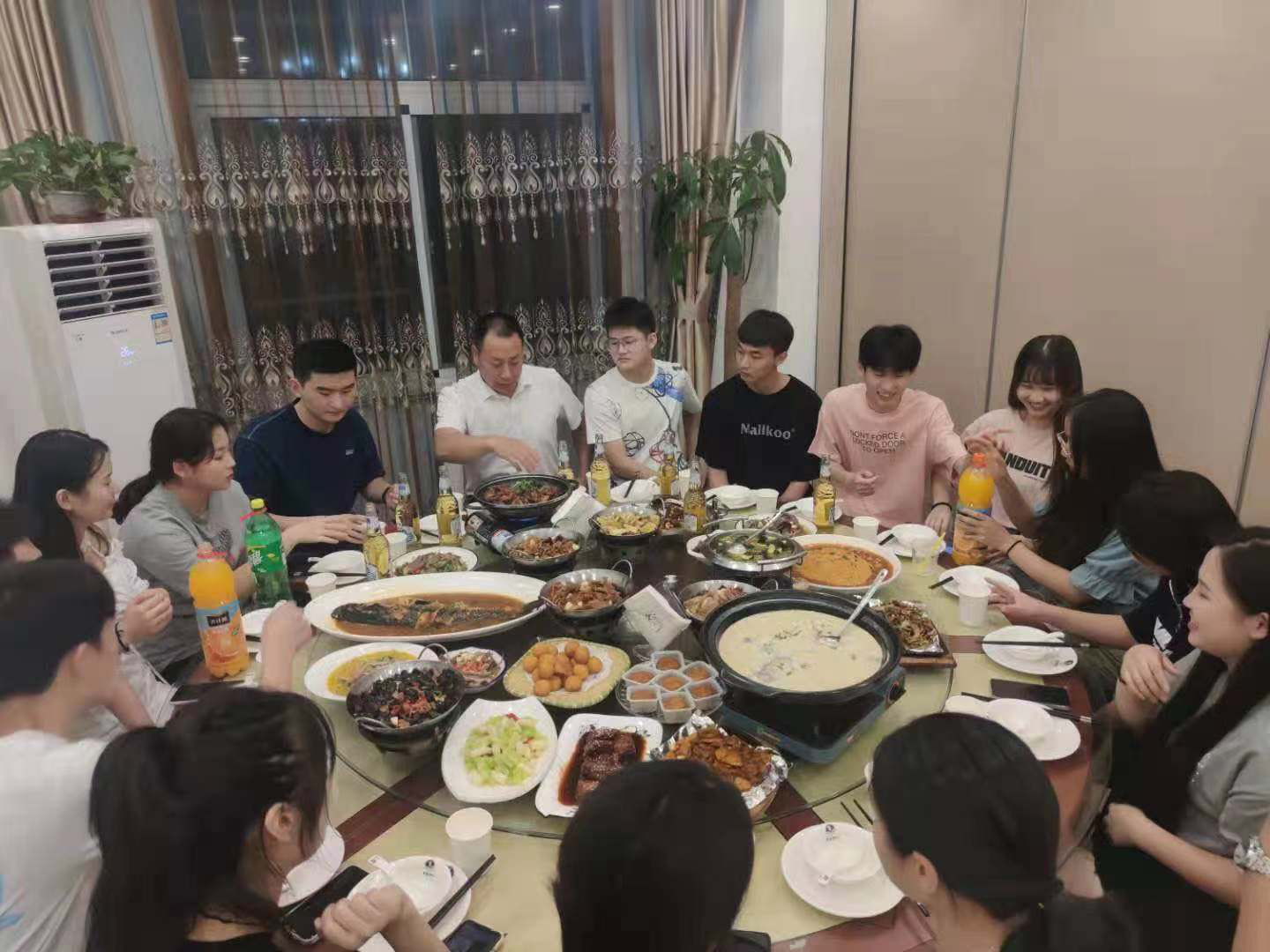 大家坐在一起聚餐、吃月饼,一片其乐融融的景象。这不仅驱散了对小家的思念,也凝聚了大家的情谊。
