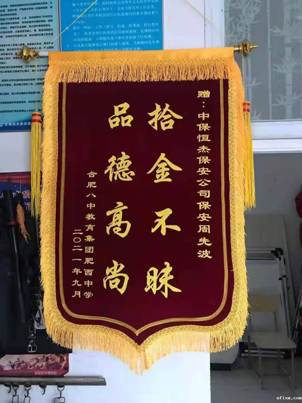 9月16日,合肥八中教育集团肥西中学领导将一面印有“拾金不昧 品德高尚”的锦旗送到保安员周先波手中,感谢他拾金不昧的爱心行为。