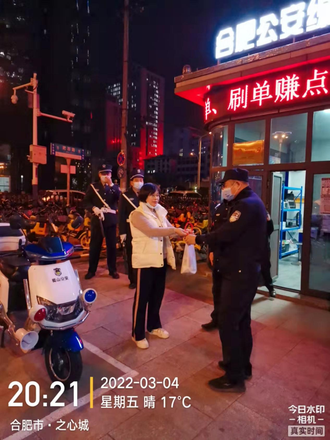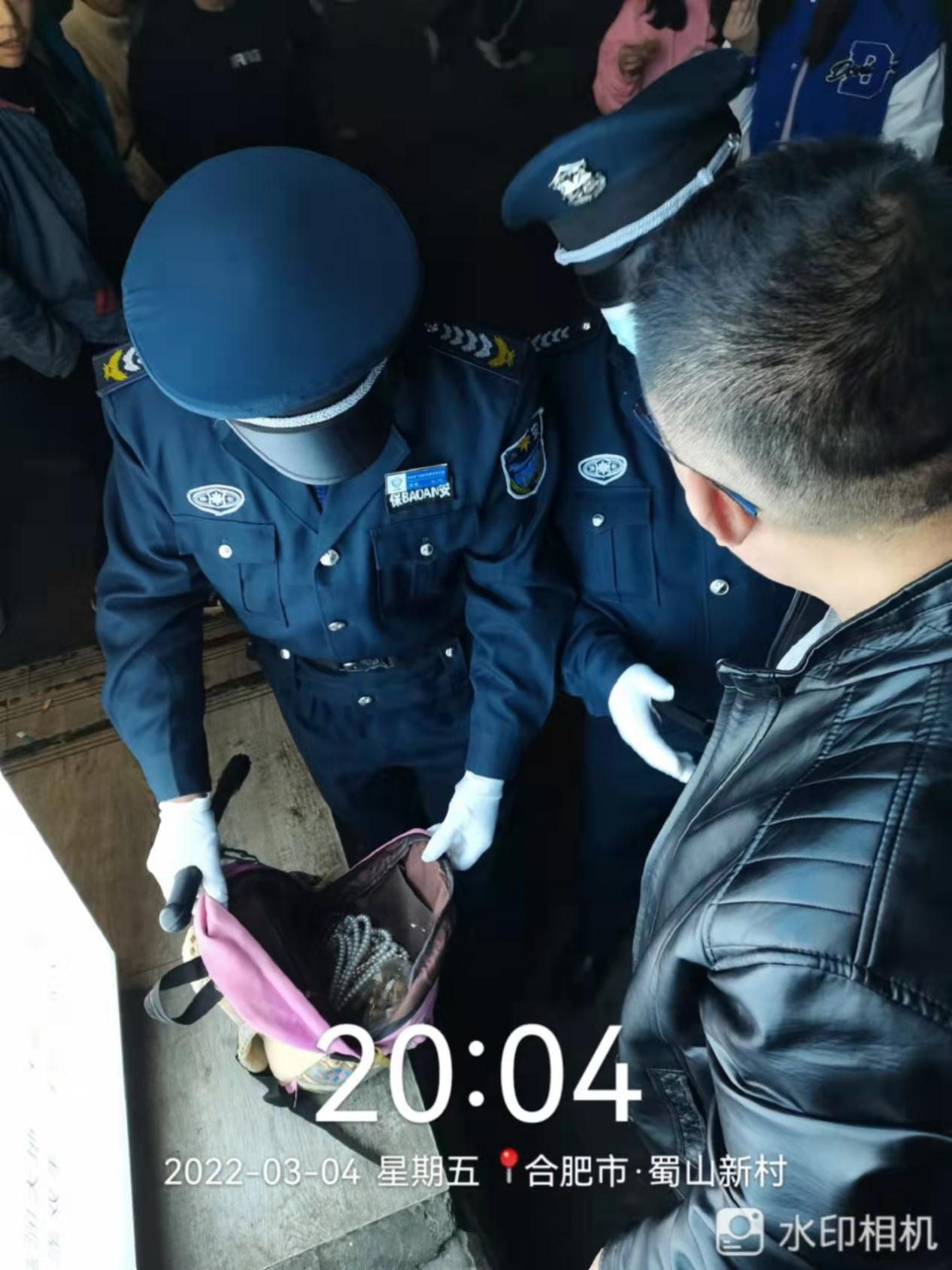 3月4日20时左右,安徽宏辉保安3名执勤队员在蜀山区之心城商场附近巡逻时,发现一辆共享单车筐内有一白色手提袋,经现场查看,袋内装有发票、珍珠饰品及其他物品,3名巡逻队员当场立即交送到附近警务站执勤民警处。经核实,失主已于当晚认领,并向警务站值班民警及3名执勤保安队员表示感谢。