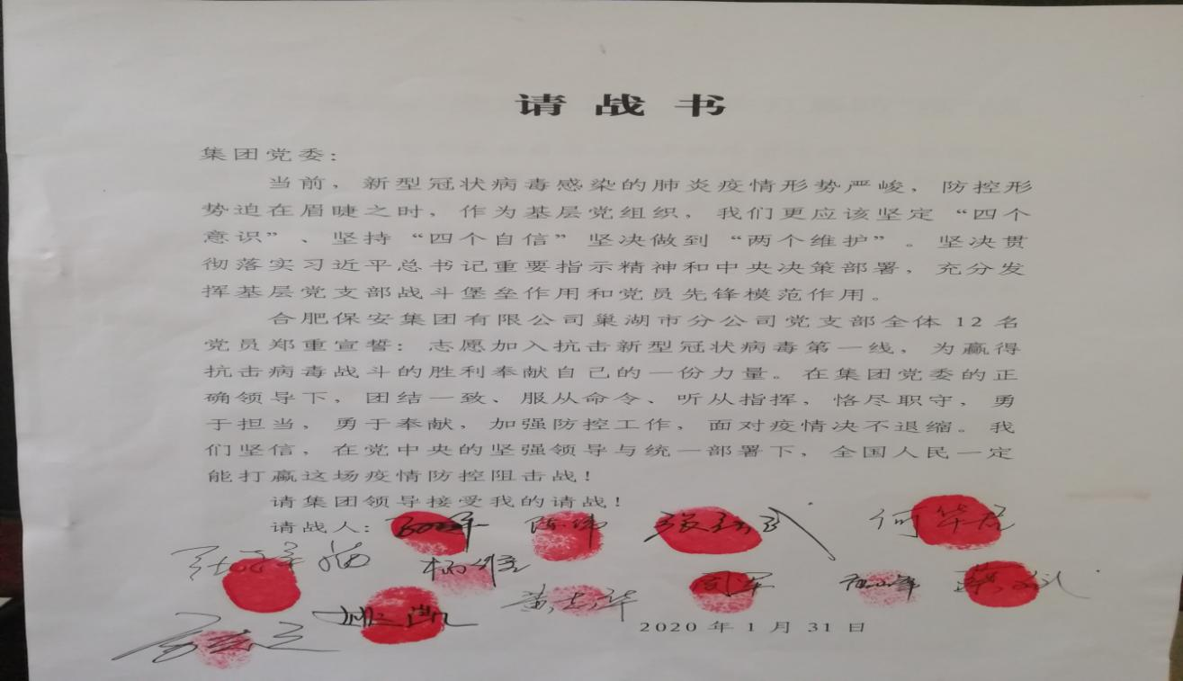 2020年1月,一场突如其来的新冠肺炎疫情打乱了人们日常生活节奏。“疫情就是命令,防控就是责任”,巢湖市分公司党支部在集团党委的直接领导下,组织党员职工积极投入到疫情防控工作之中,在支部的统一牵头带领下,全体党员干部纷纷通过支部向集团党委请战,疫情当前绝不退缩,并在请战书上按上了鲜红的红手印。