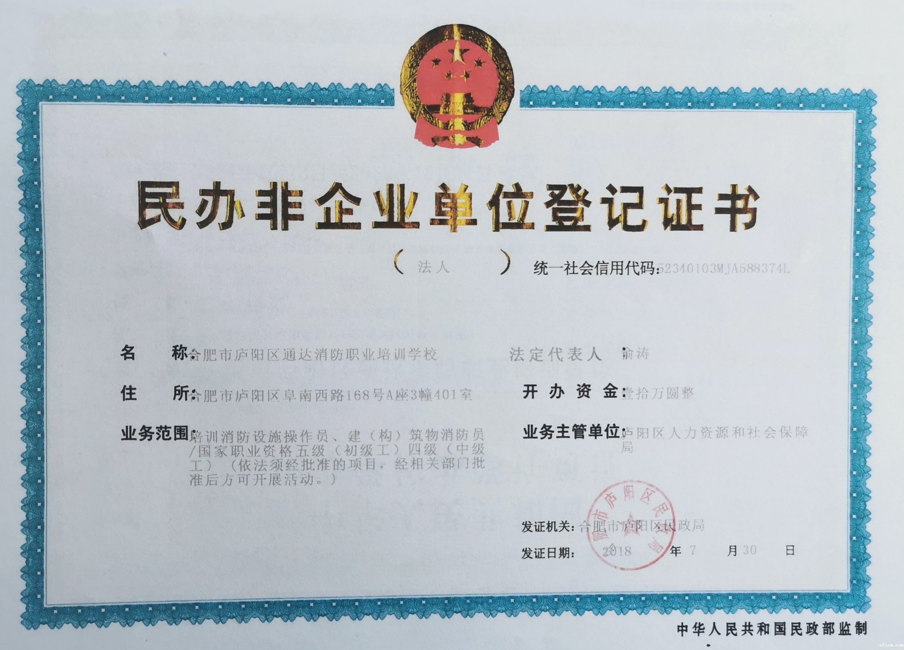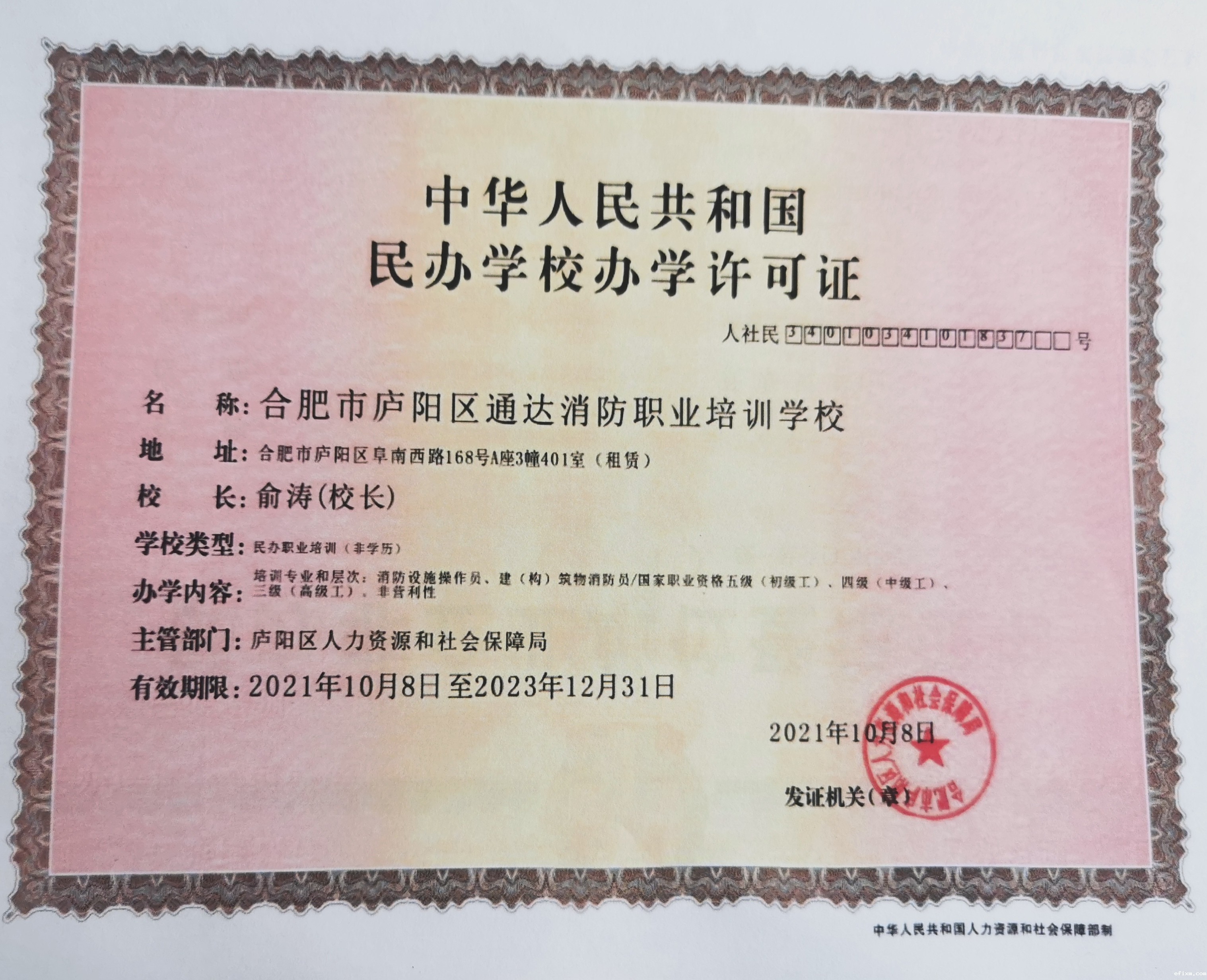 一、学校简介 合肥市通达消防职业技能培训学校一一位于合肥市庐阳区。学校成立于2018年7月30日,属于民办非企业单位。 该校经合肥市庐阳区消防大队申请报备,经庐阳区民政局申请登记办理营业执照、经过庐阳区人力资源社会保障局审核批准办学许可证,并通过中国消防协会认可! 合肥市通达消防培训学校:由原安徽省消防总队服役多年的退役军人个人自筹资金共300多万元组办。学校有原安徽省消防总队经验丰富的专家学者担任顾问、原安徽省消防总队服役多年的消防注册工程师担任教研主任、原消防总队退役军人担任讲师,教员团队拥有丰富的理论和实战经验。自建校以来培训人次累计12000多人。 该校下辖有:蚌埠分校、六安分校、毫州分校、阜阳太和分校,以及安徽沁诺教育安全培训和康昇建筑消防工程公司。 (一)师资力量 本校是安徽省消防协会会员单位,现有教职工35人,其中具有中、高级职称(一级消防工程师)2人,(二级建造师)2人,(安全生产管理员 A 证)1人,(安全生产管理员 B 证)1人,(安全生产管理员 C 证)1人,(安全培训教师资格证)10人,中级职称(中级消防设施操作员证)8人。通过省消防协会认证并聘请省内消防安全领域具有较高理论知识和丰富工作经验的专业技术人员到学校担任专职消防技能辅导员、理论教员、实训员等,分别负责学员的消防技能操作训练、消防理论教学实践等工作。 (二)通达消防职业技能培训内容: 消防设施操作员、建(构)筑物消防员/国家职业资格五级(初级工)、四级(中级工)、三级(高级工)、以及消防维保和消防安全培训。 其中下辖的安徽沁诺教育培训内容: 低压电工、高压电工、焊工、高处作业、制冷与空调作业、危险化学品安全员,企业负责人以及安全生产管理人员培训等。 学校联系人:聂余勤 联 系 电 话:13083050466