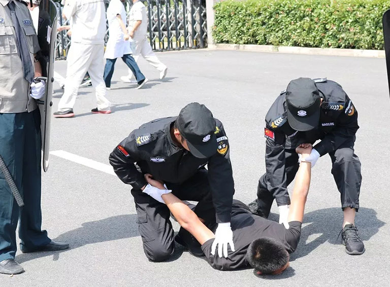 携带警棍、盾牌等防暴装备的防暴组快速到达现场,盾牌组员配合疏散组保护转移围观职工,防暴队员临危不惧,展开反恐队形,分别从不同区域向“暴徒”迅速靠拢,快速出击,节节压制,将“暴徒”制服,险情排除。