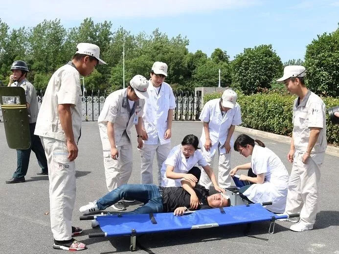 矛盾加剧,围观职工意外受伤,保安队长立即呼叫防暴、疏散、医务各小组前往现场,同时拨打110报警。