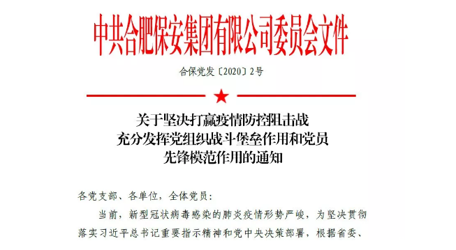 为坚决贯彻落实习近平总书记重要指示精神和党中央决策部署,根据省委、市委、市国资委党委以及兴泰控股党委疫情防控工作部署要求,合肥保安集团有限公司党委带领公司党员、团员与全体员工全力以赴做好疫情防控工作,充分发挥各级党组织在疫情防控工作中的战斗堡垒作用和党员先锋模范作用,为坚决打赢疫情防控阻击战提供坚强政治保证,让党旗在防控疫情斗争第一线高高飘扬。