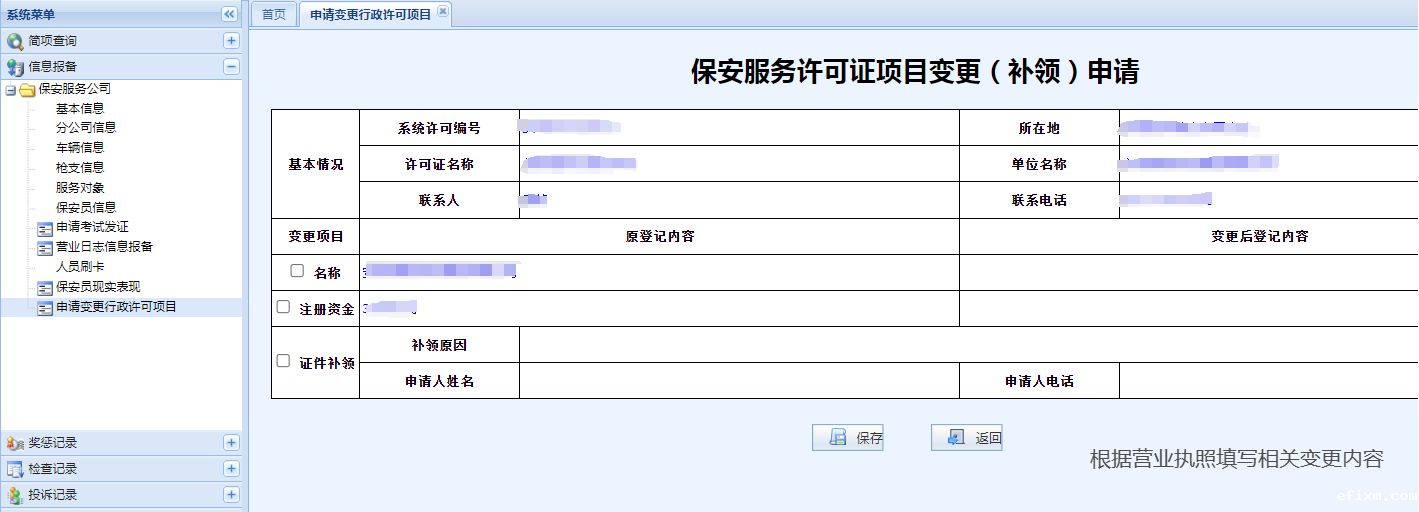 2、根据所需变更的行政许可项目填写变更内容后点击“保存”。