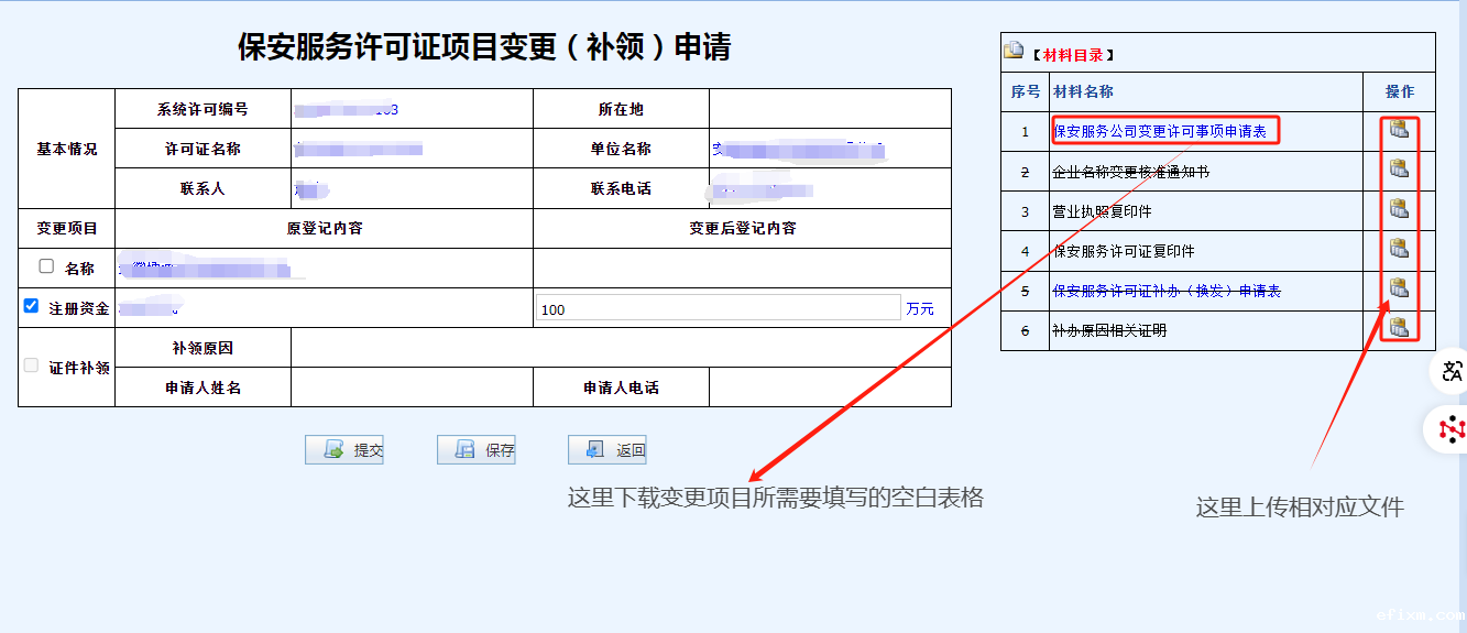 3、填写《保安服务公司变更许可事项申请表后》,上传相应文件后,点击提交。